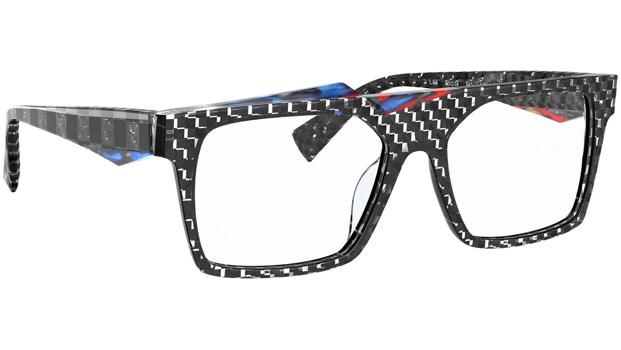 Occhiali da vista Alain Mikli modello A03123 variante colore scacchiera nero e cristallo / blu e rosso, codice colore 001. Alain Mikli è stato il primo marchio a sostenere l’idea di occhiale come accessorio. Dalla fusione di arte e moda nascono montature da sempre sinonimo di unicità e provocazione, contraddistinte per il design originale e le combinazioni di colori esclusive.