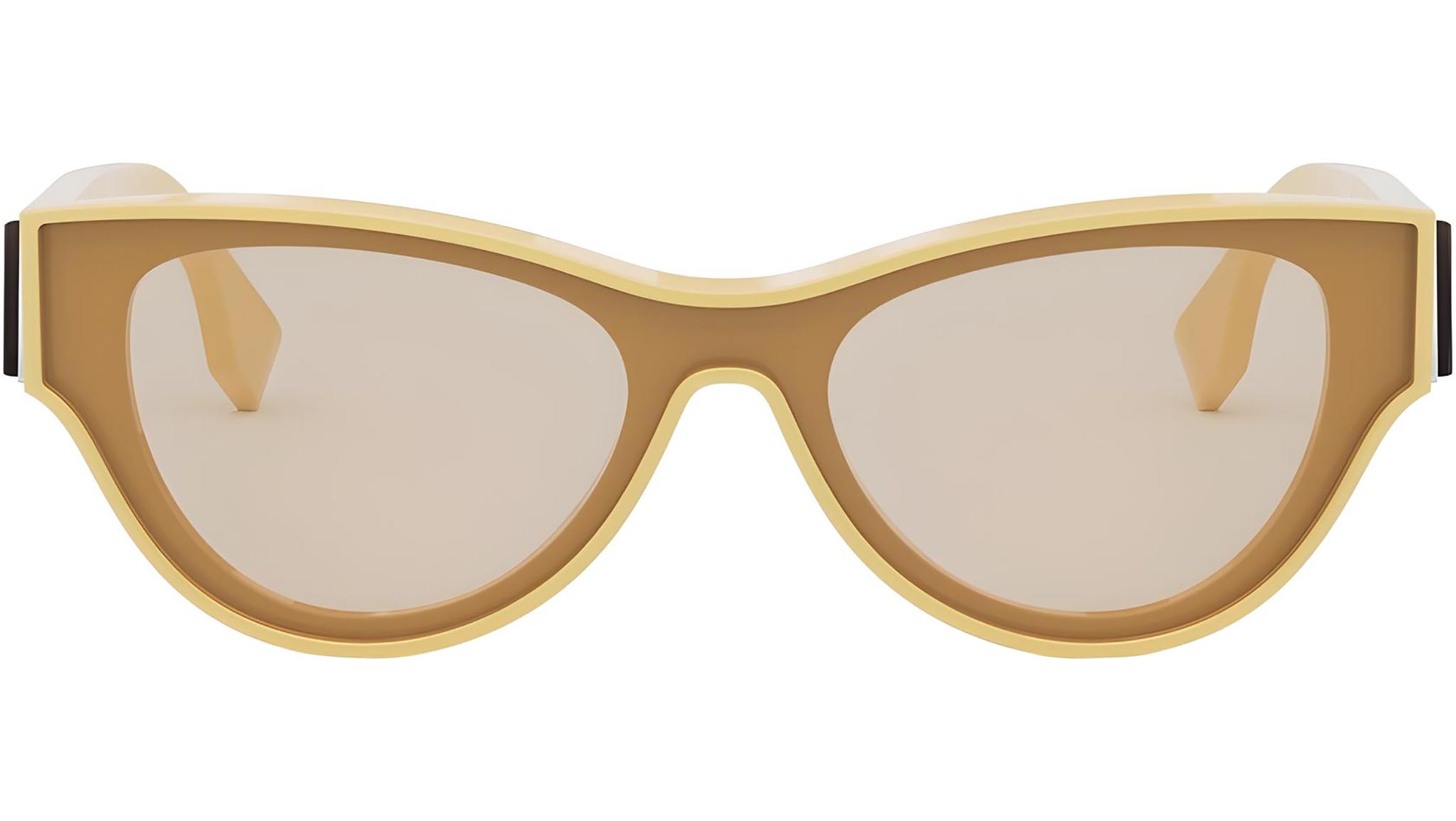 Occhiali da sole FENDI donna linea Fendi First modello FE40135I codice colore 39E beige. La linea Fendi First più venduta, ora in una nuova interpretazione in acetato, con forma cat eye, impreziosita dal logo Fendi First in metallo sulle aste e dal design raffinato delle lenti a mascherina frontale. Rivenditore autorizzato FENDI online. Gli occhiali vengono consegnati con custodia e accessori originali.