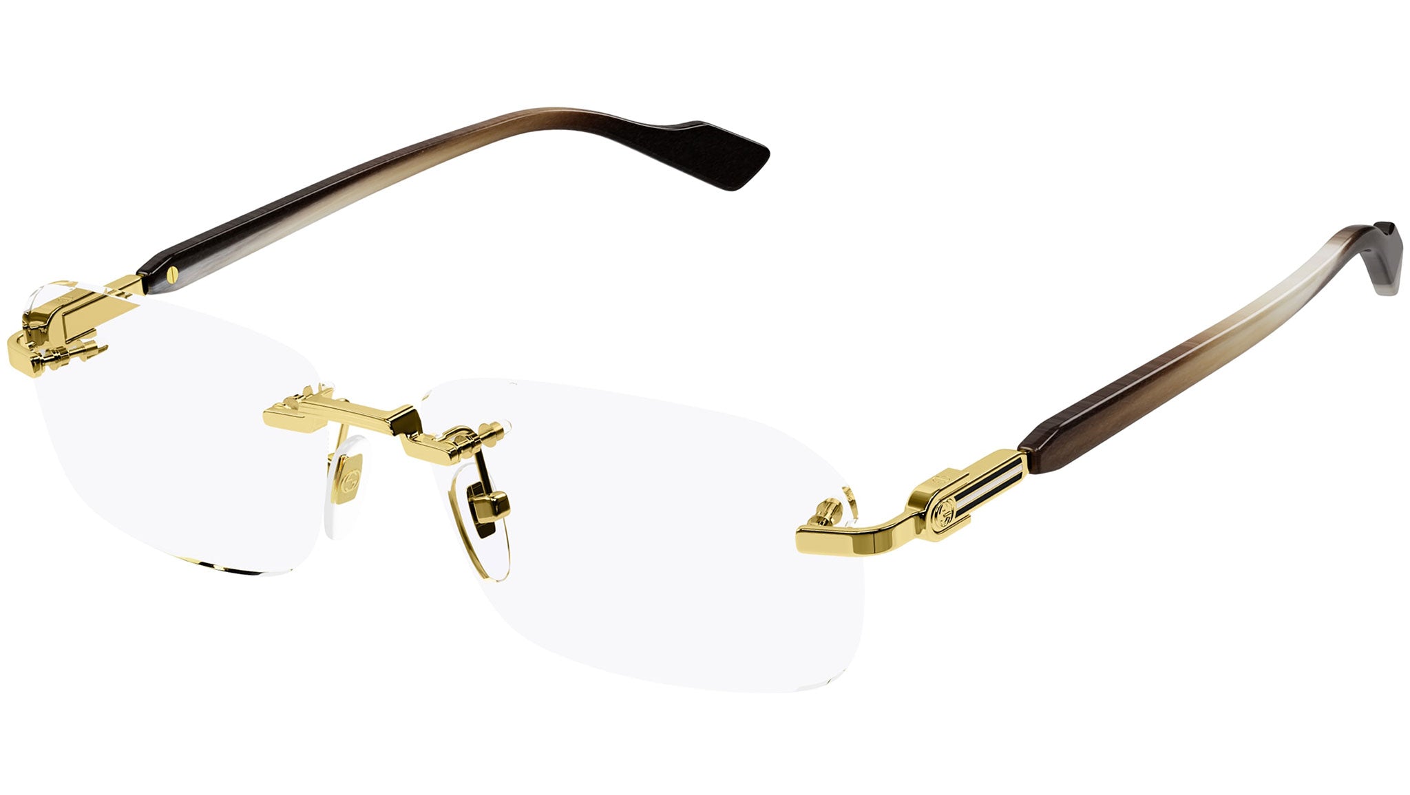 Occhiali da vista Gucci Logo modello GG1221O variante colore 002 oro giallo lucido con astine color marrone.