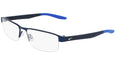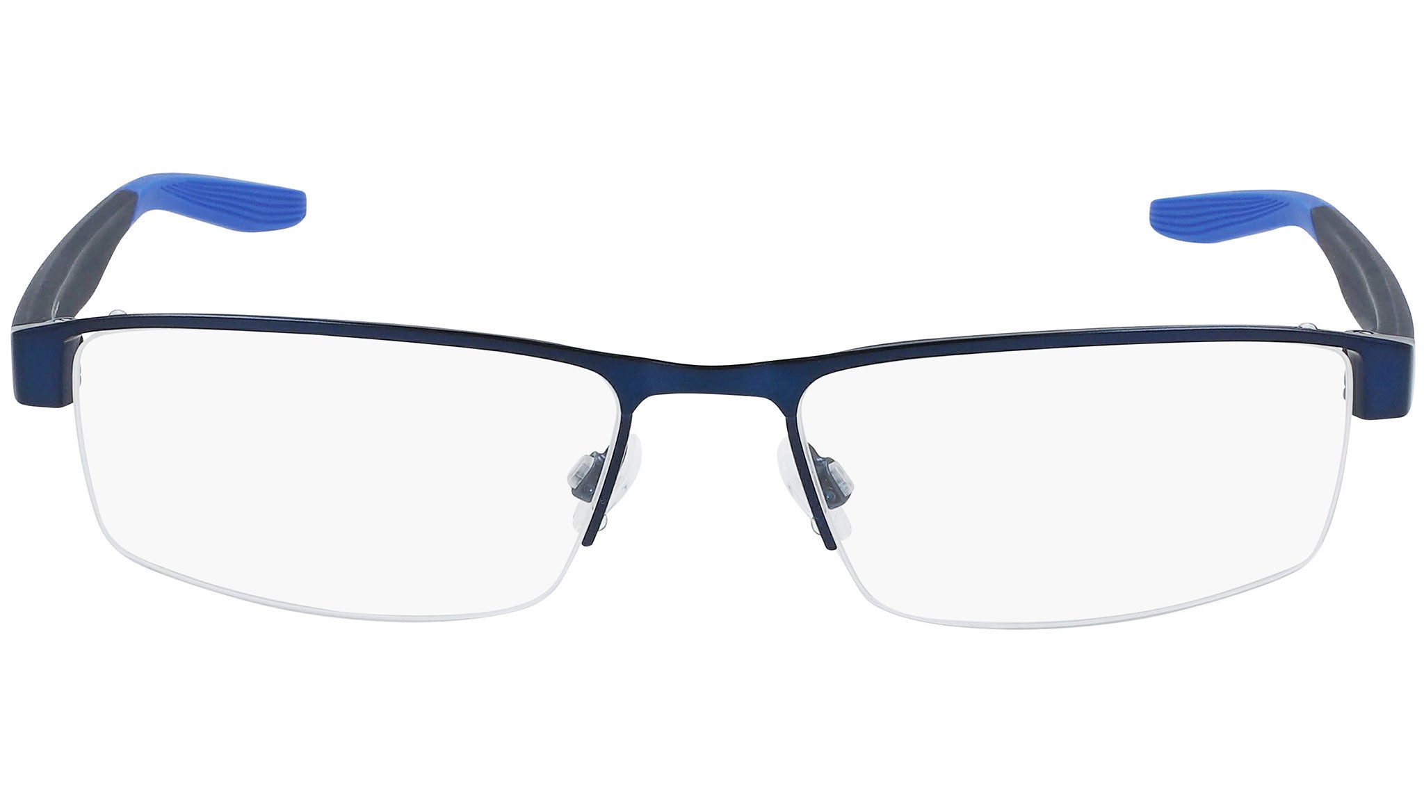 Nike Optical 8137 model featuring satin navy frame and matte solid obsidian temple. Made with metal and bio-based, injected plastic that minimizes environmental impact while adding durability and lightness to the frame.