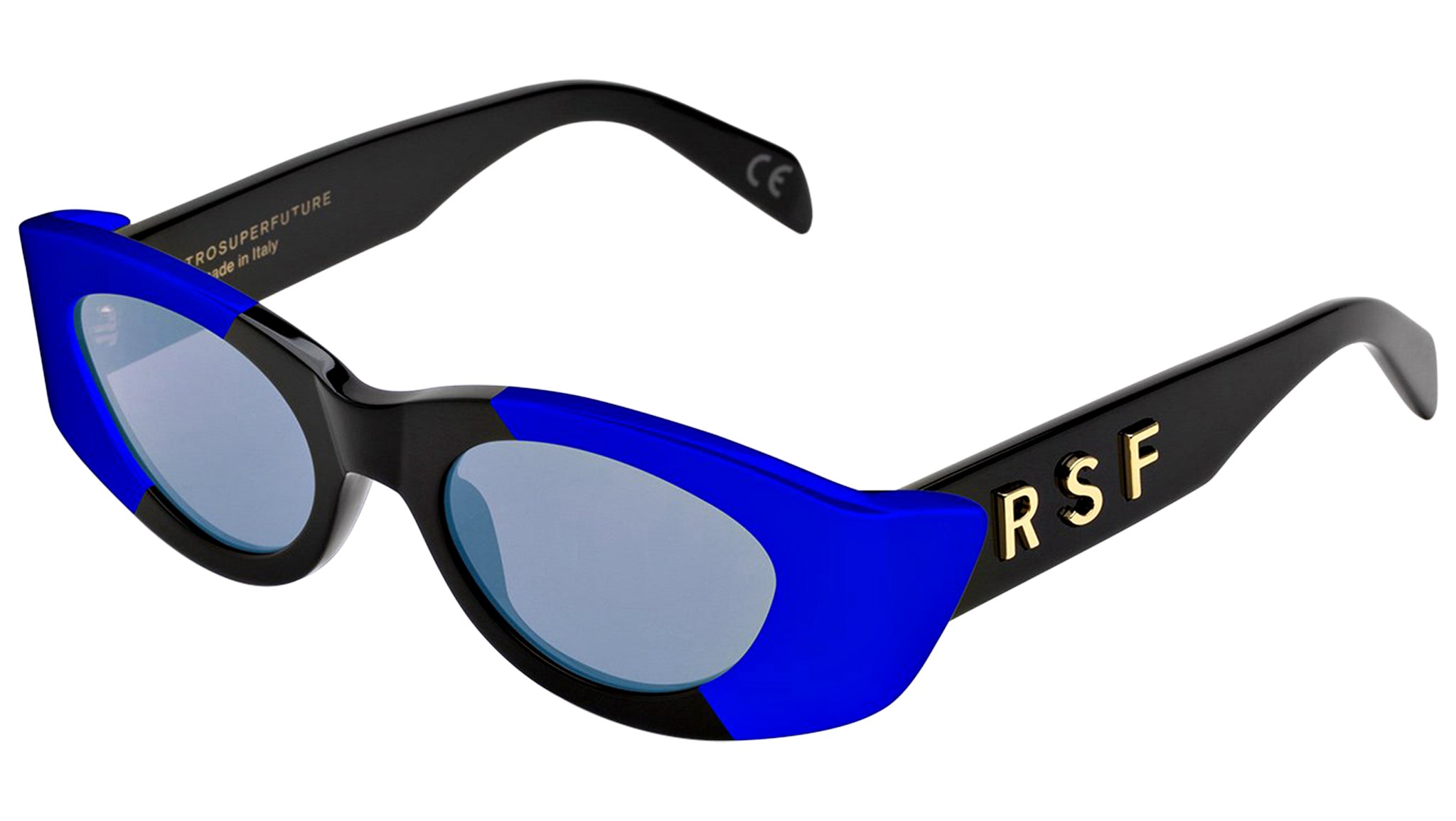 Designed as an exclusive, stand-out piece, Atena is a statement silhouette for savvy contemporary audiences. The model features a wide profile, with unique folded musetti that wrap around the sides. Metal RSF decors are mounted on the exterior of the temples for a high-end detail. This version matches electric blue and black acetates with bold blue lenses. The box contains a semi-hard case and a cleaning cloth.